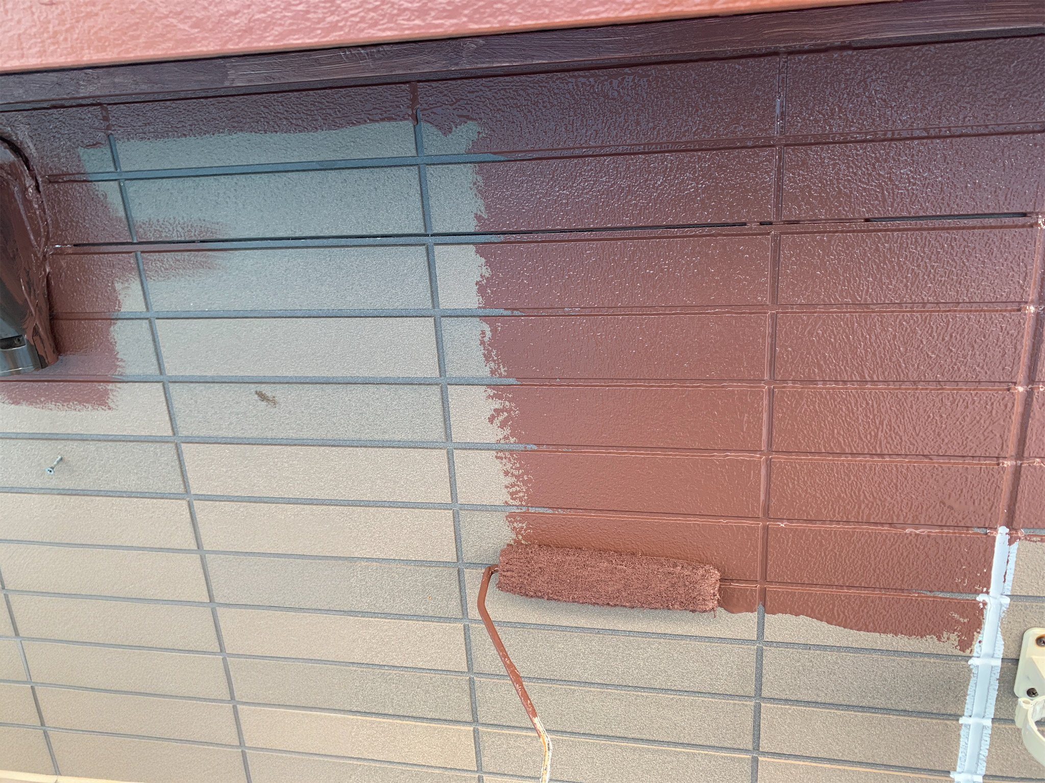外壁にシーラー塗装をします。既存の外壁と新しい塗料の密着を良くし、捲れ防止になります。