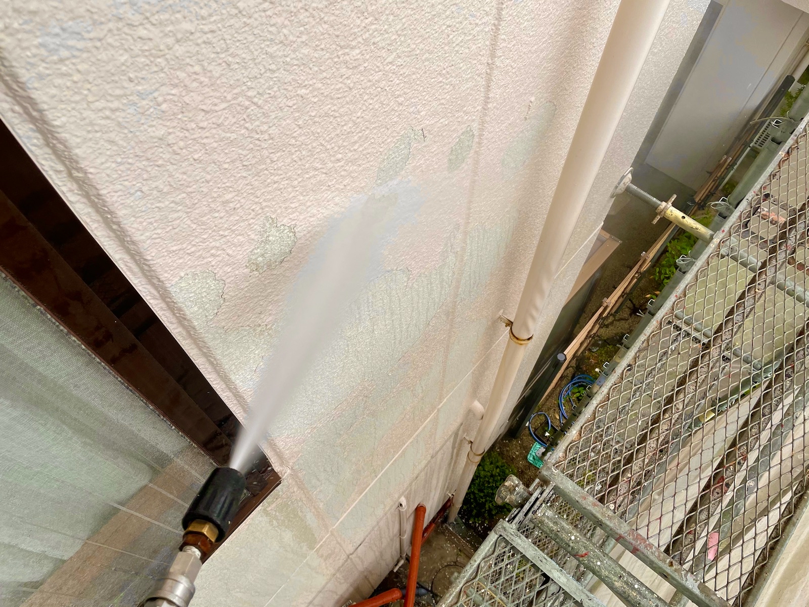 外壁のほこりや汚れを高圧の水で使い洗い流します。