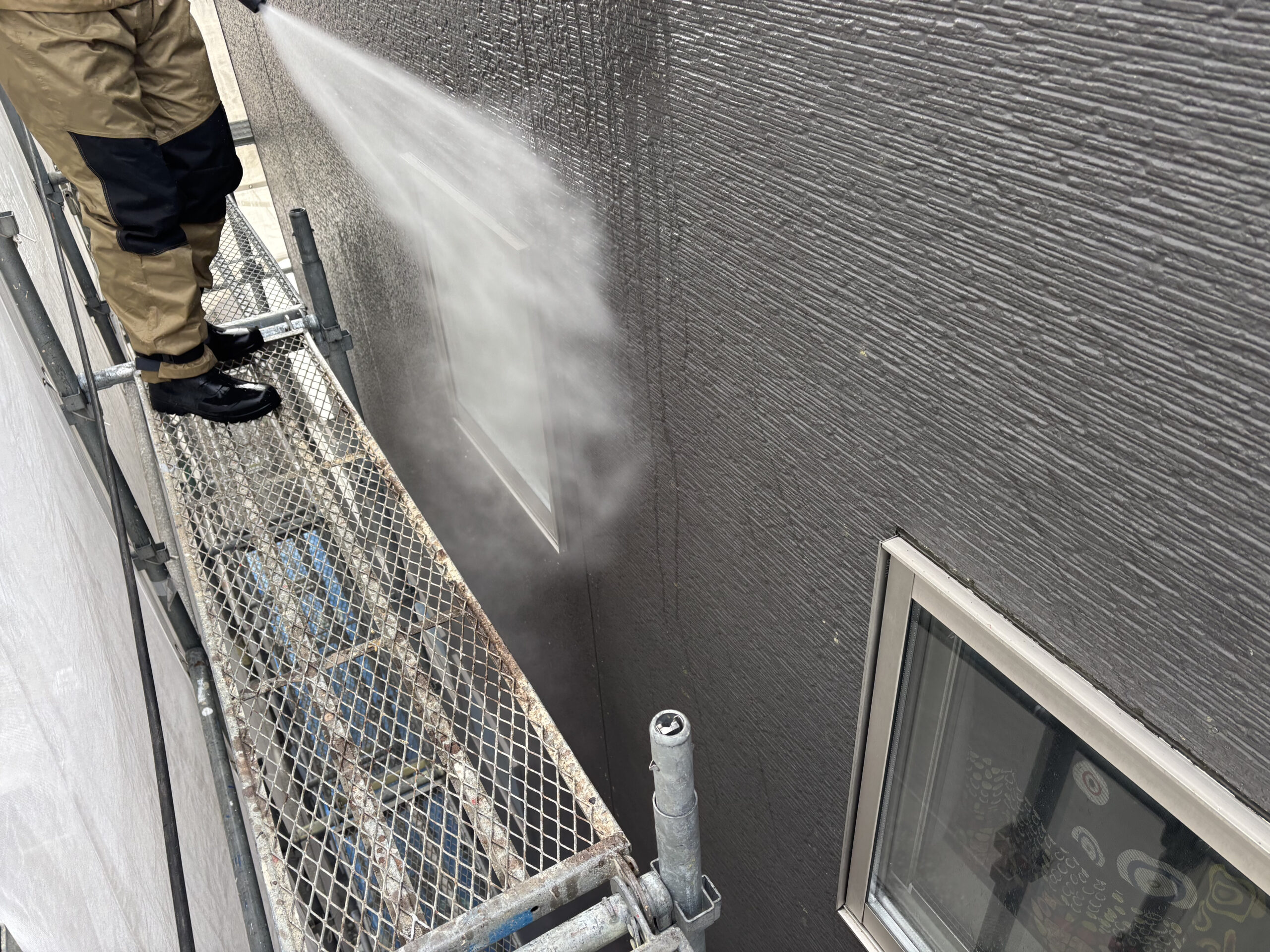 外壁のほこりや汚れを高圧の水で使い洗い流します。