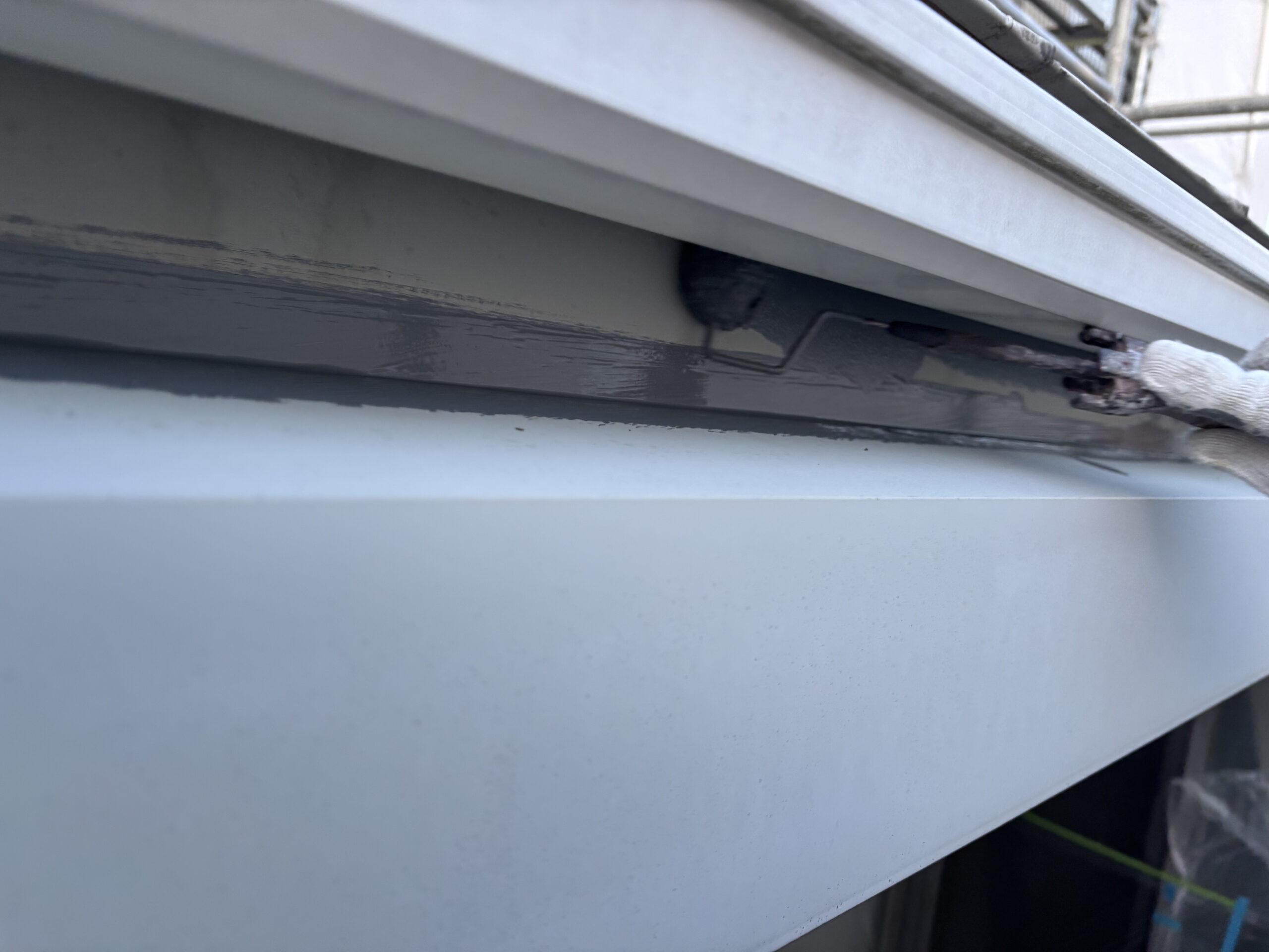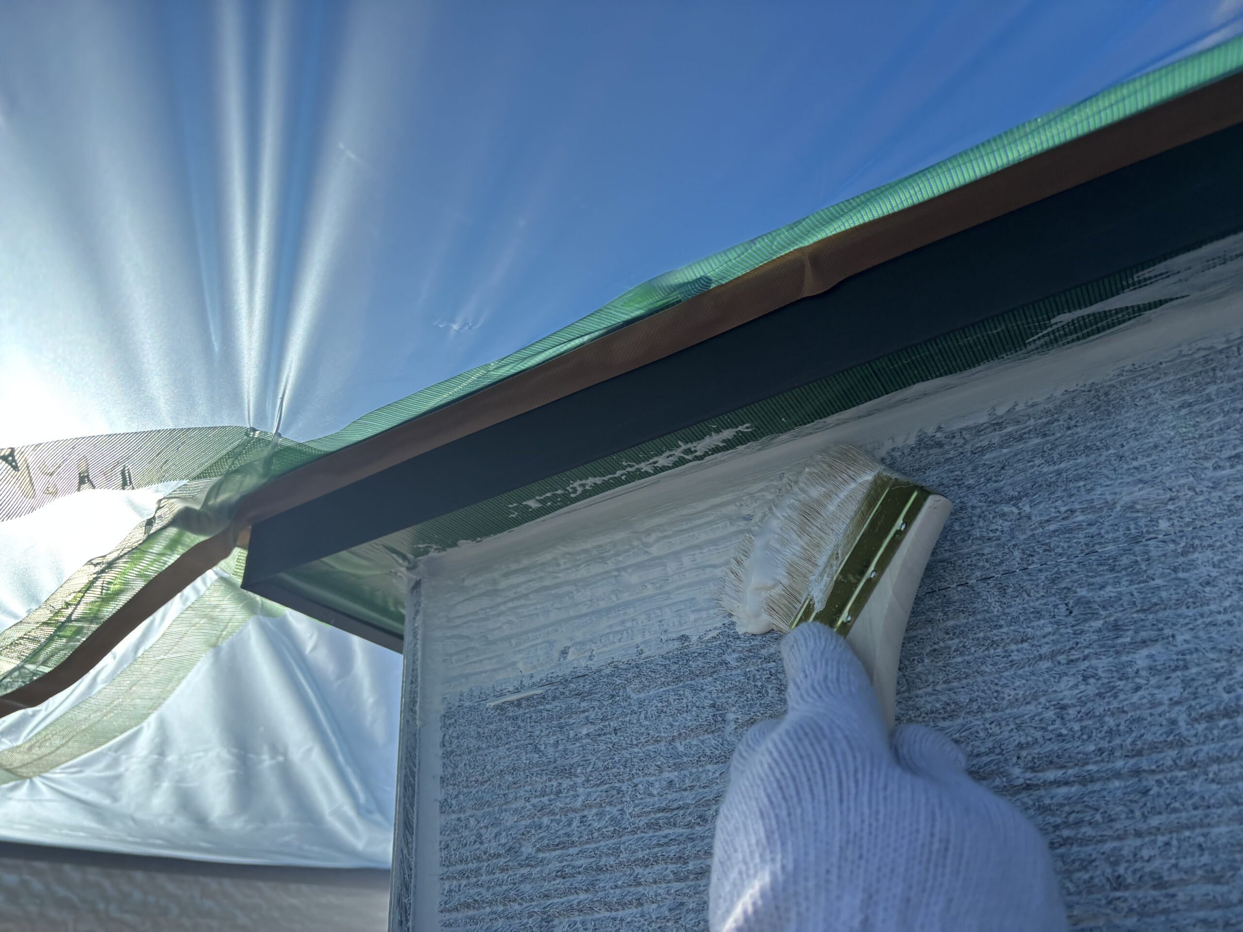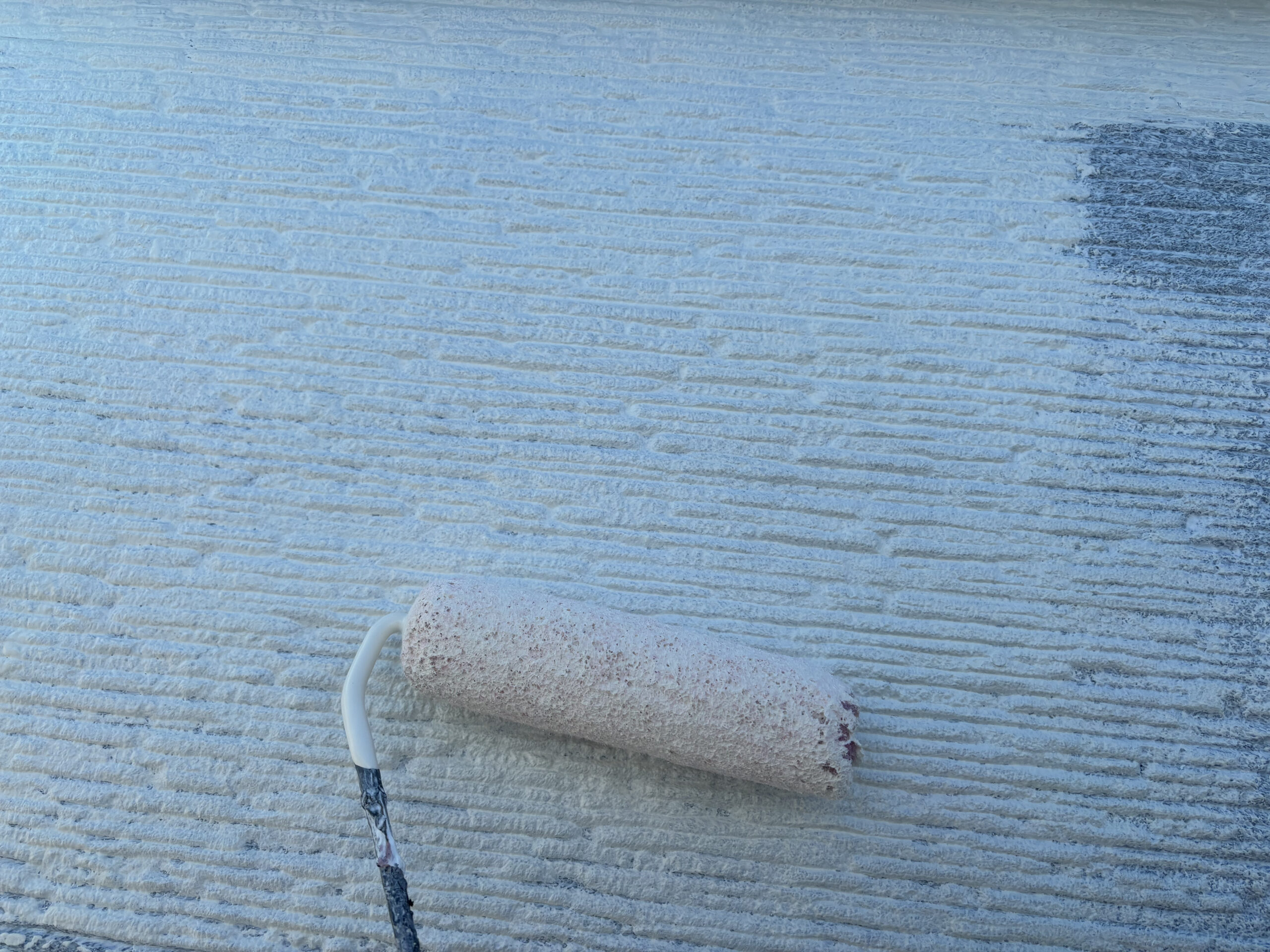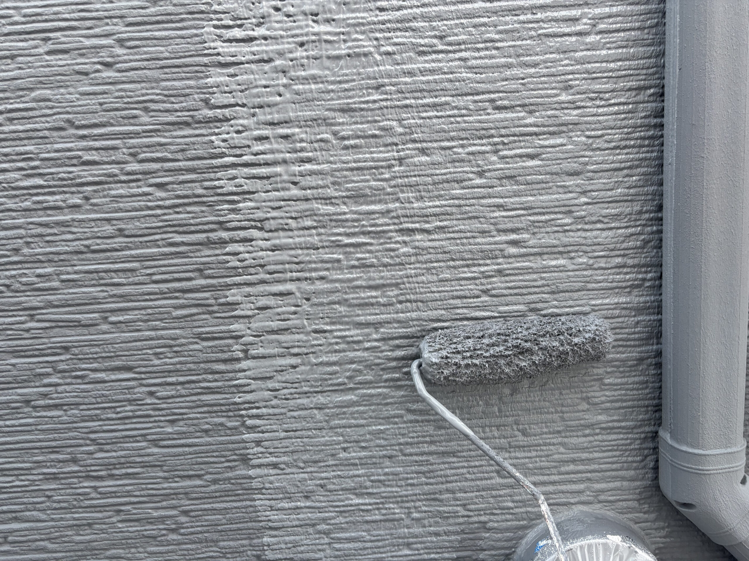 外壁にシーラー塗装をします。既存の外壁と新しい塗料の密着を良くし、捲れ防止になります。