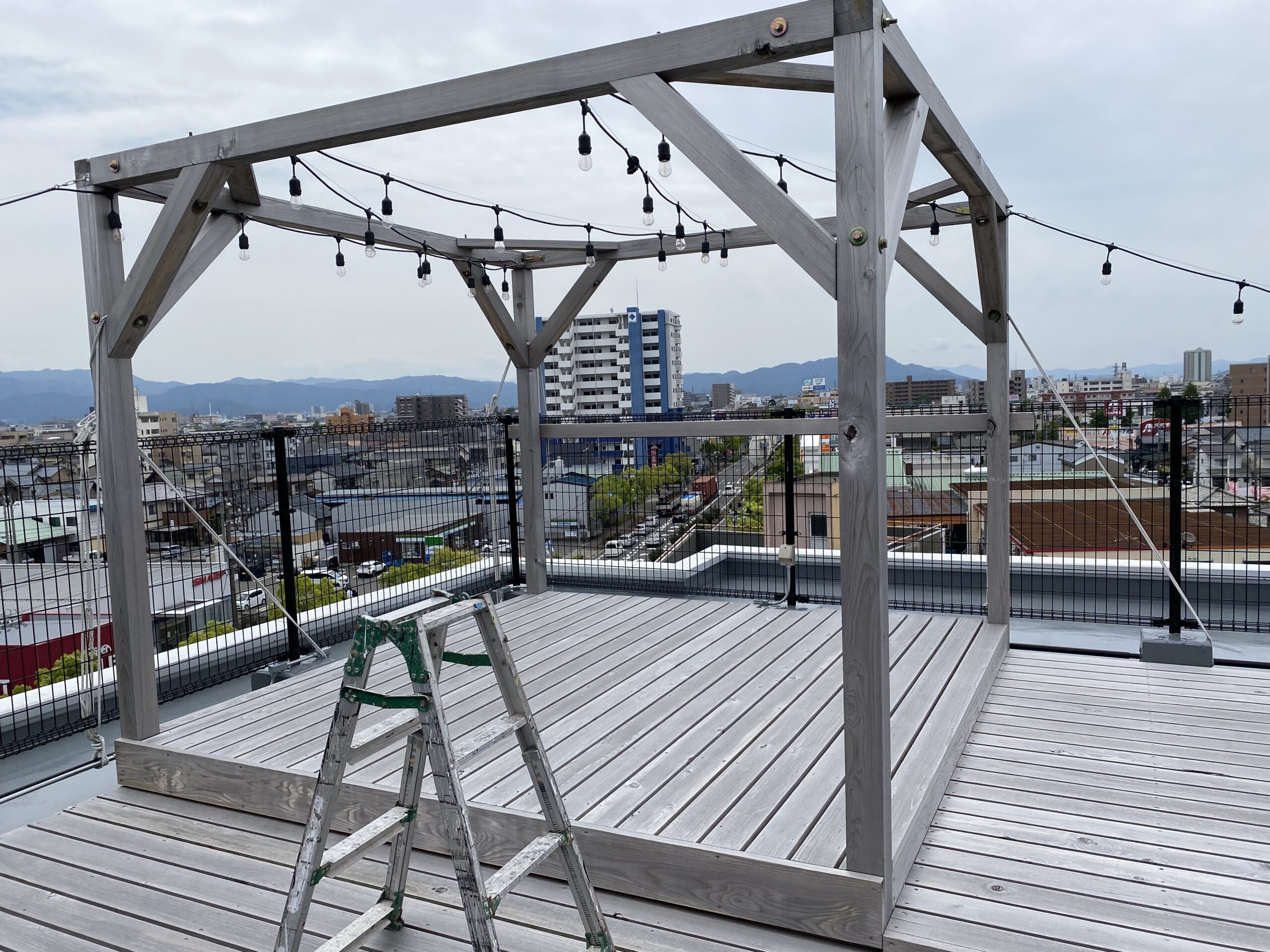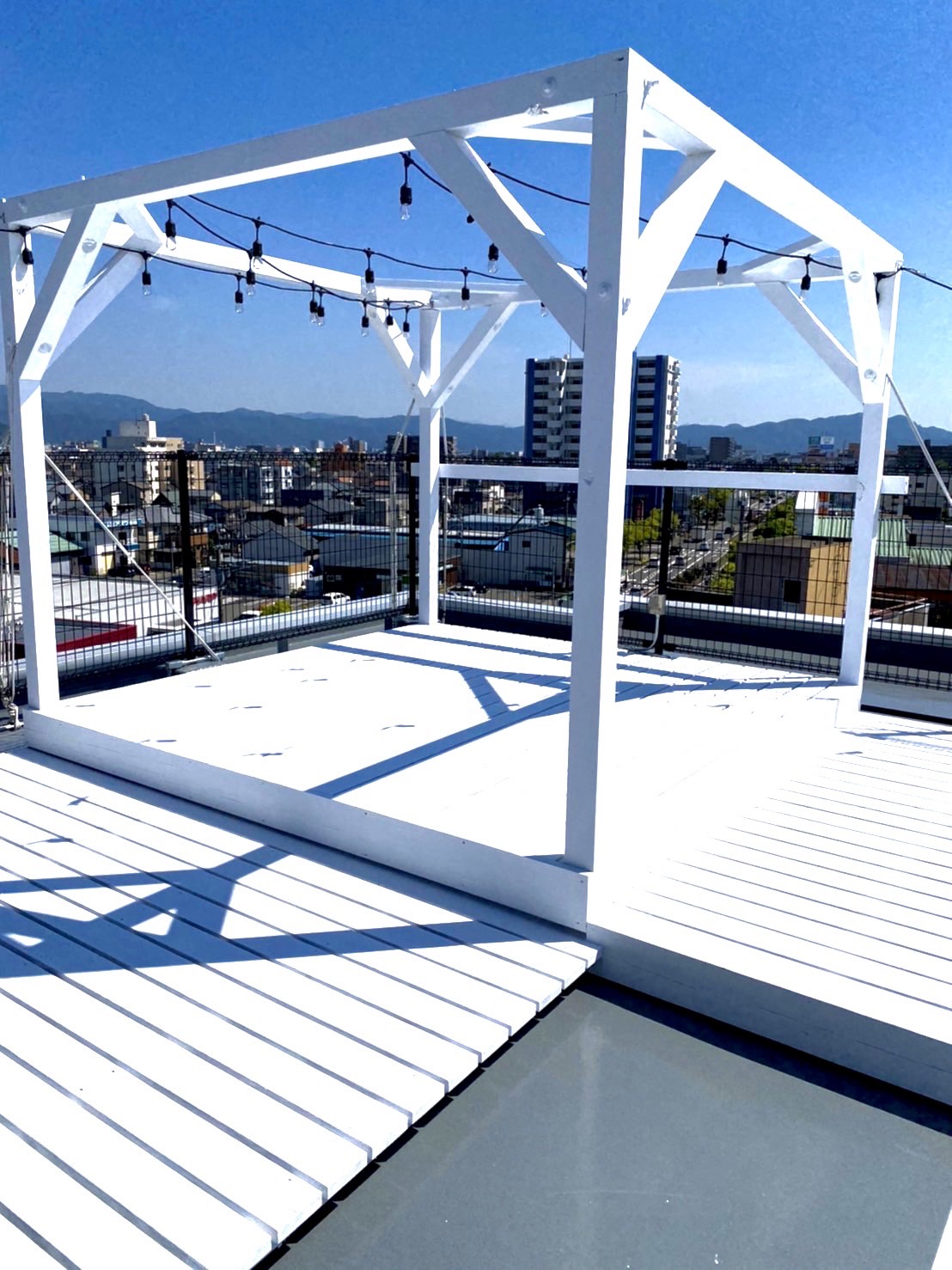 - 某マンションの屋上に設置してあるコミュニティスペースの櫓です。組み上げて数か月で色合いが風化してしまったので、今回は新たにホワイト塗装しました。リゾート感が出てお客様も喜んでくれました。椅子に座り、ゆっくりビールを飲みたくなりました。